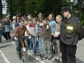 Na zdjęciu obok st. post. S. Zieliński podczas przeprowadzania egzaminu na kartę rowerową. Egzamin zdawała klasa IV b, której wychowawczynią jest p. Joanna Nowak –Zielonka. W maju podobne egzaminy zdawały dzieci ze wszystkich klas czwartych mszczonowskiej Szkoły Podstawowej- w sumie około 120 uczniów.